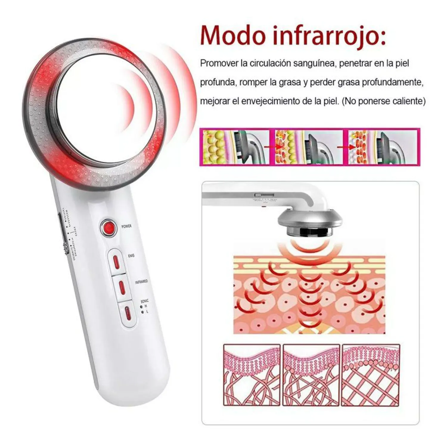 🔴 Ultrasonido: Penetra en capas profundas para mejorar el metabolismo celular y reducir grasa.