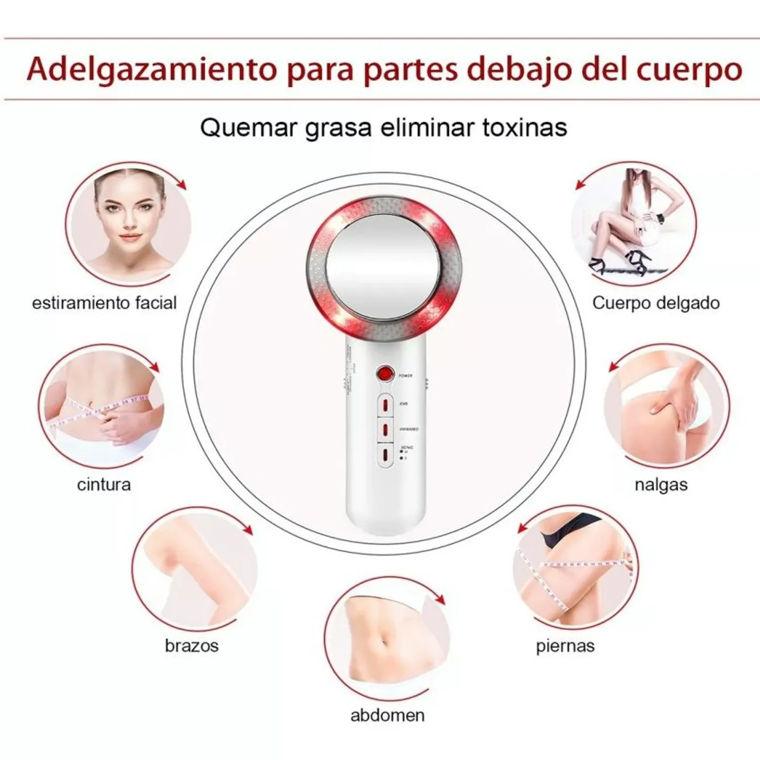 Dile adiós a la celulitis y la grasa localizada con este completo dispositivo reductor con ultrasonido, infrarrojo y EMS (estimulación muscular eléctrica). Ideal para uso en abdomen, piernas, brazos y glúteos.
